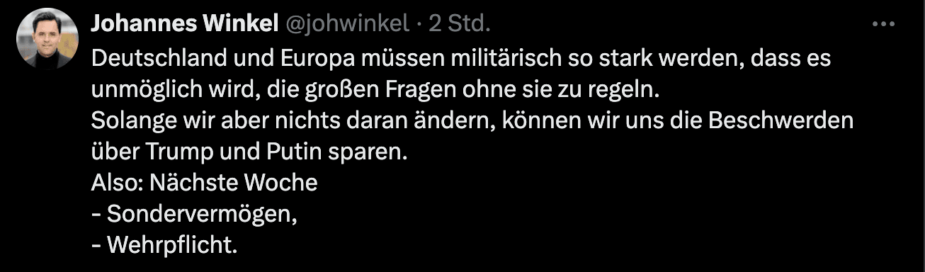 Für Country und Continent. So redet, wessen Vorstellung von Krieg ist, vor einer Botschaft Schilder in die Luft zu halten, in Trillerpfeifen zu pusten oder auf X zu posten. Andere machen sich in der Jungen Union gleich daran, das Nachschub-Problem für den Fleischwolf zu lösen, indem sie die sofortige Wiedereinführung der Wehrpflicht fordern: „Deutschland und Europa müssen militärisch so stark werden, dass es unmöglich wird, die großen Fragen ohne sie zu regeln. Solange wir aber nichts daran ändern, können wir uns die Beschwerden über Trump und Putin sparen. Also: Nächste Woche Sondervermögen, Wehrpflicht.“ (Johannes Winkel)