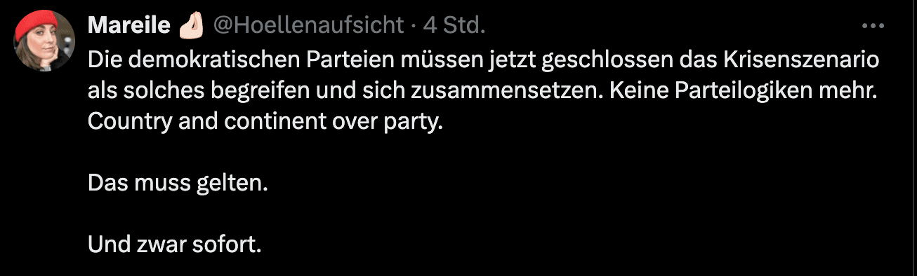 Doch mit voller Hose ist gut stinken und die Rhetorik in den Sozialen Medien überschlägt sich im gestreckten Galopp. Mit einem begeisterten „Ich kenne keine Parteien mehr, nur noch Deutsche“ rief Wilhelm Zwo die Soldaten zu den Waffen, und deutsche „Influencer“, die sich immer auf der richtigen Seite der Geschichte wähnen, klingen heute schon wieder ähnlich: „Die demokratischen Parteien müssen jetzt geschlossen das Krisenszenario als solches begreifen und sich zusammensetzen. Keine Parteilogiken mehr. Country and continent over party. Das muss gelten. Und zwar sofort.“ (Mareile)